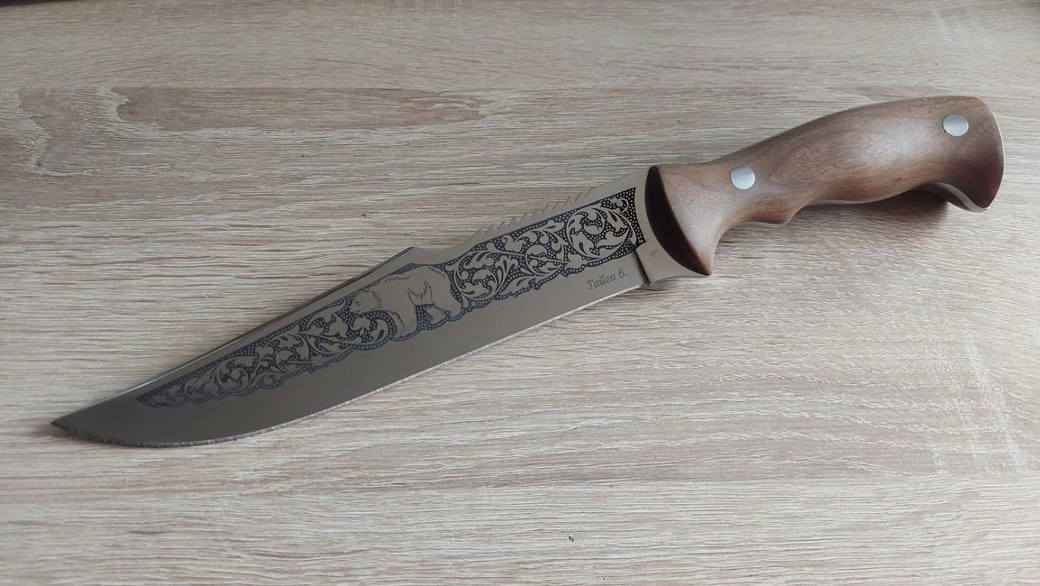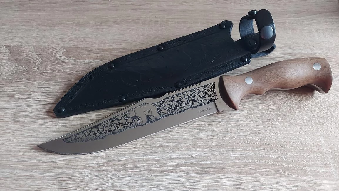 When producing blades, Russian stainless steel, carbon and last but not least high quality damask steel of our own production is used. Steel 65X 13 is used in the basic variant. After tempering to 56 β 58 HRC temper, this steel facilitates excellent cutting characteristics for aΒ longer time. Blades are different thanks to comeback to traditions which includes decoration with various decorative motives. These involve hunting scenes, pictures of wildlife and birds or the traditionally stylised plant motive. Furthermore, each product can be embellished with silver, nickel silver or blackening. The final look of each knive is unique and ever unrepeatable. An individual sheath is produced for each knife or sabre which can also be decorated with traditional motives using stamping or engraving.